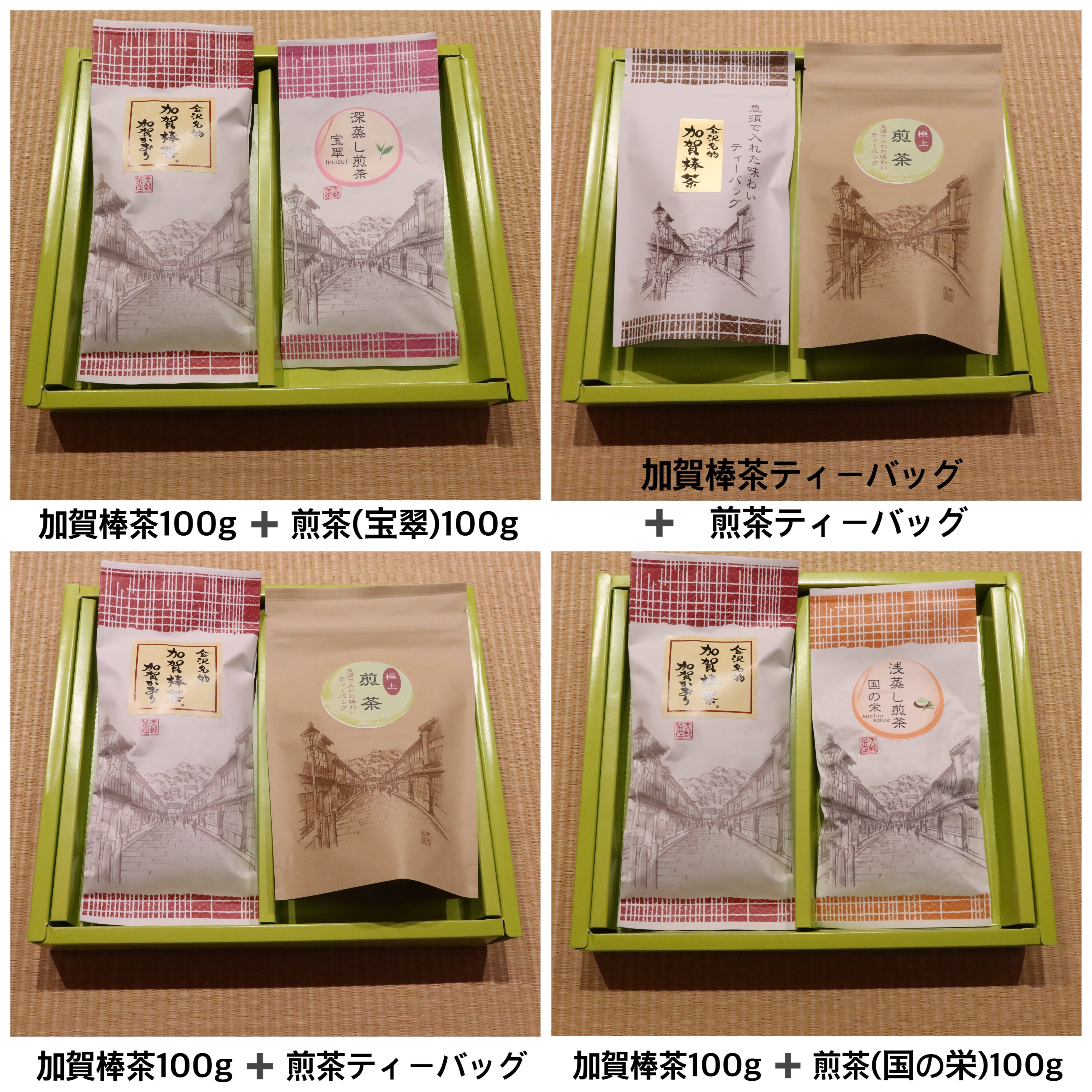 加賀棒茶100g + 煎茶-宝翠-100g (箱・29cm×25cm、包装代500円込) ※上記商品は同価格の商品と内容を変更できます。 〈例〉加賀棒茶ティーバッグ10個入り(750円)➕煎茶ティーバッグ 15個入り(1300円) ご注文時に備考欄にて ご希望の商品名を記載してください。 (記載がない場合は、加賀棒茶100gと煎茶-宝翠-100g でお作りします。) ※熨斗をご希望のお客様は お手数ですがホームページ、お電話、FAXにて御注文くださいませ。